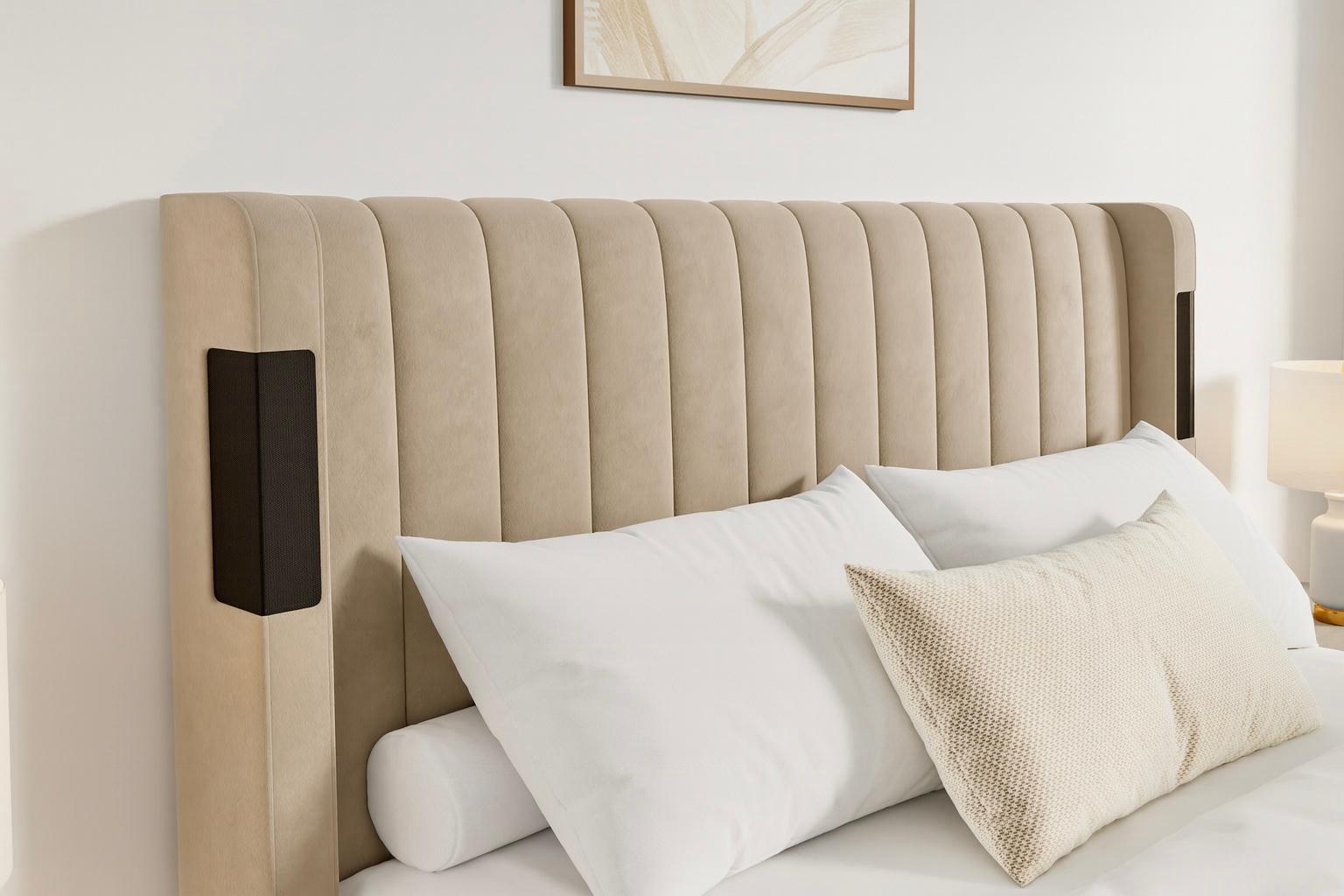 Winged padded headboard with integrated speakers