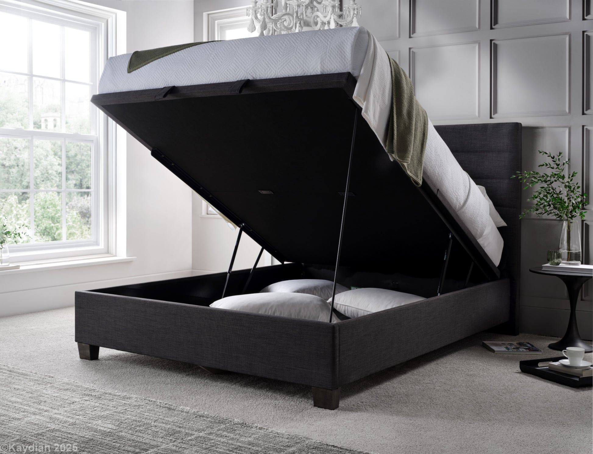 Modern and practical, The Appleford from the Haven Collection by Kaydian Design features a sleek horizontal stitch padded headboard, spacious floating floor ottoman storage, and a ventilated platform base. Easy-access dual lift-up straps and a hydraulic-assisted system make storage simple, while a built-in safety bar ensures secure access. Upholstered in premium fabrics and crafted using sustainable wood.