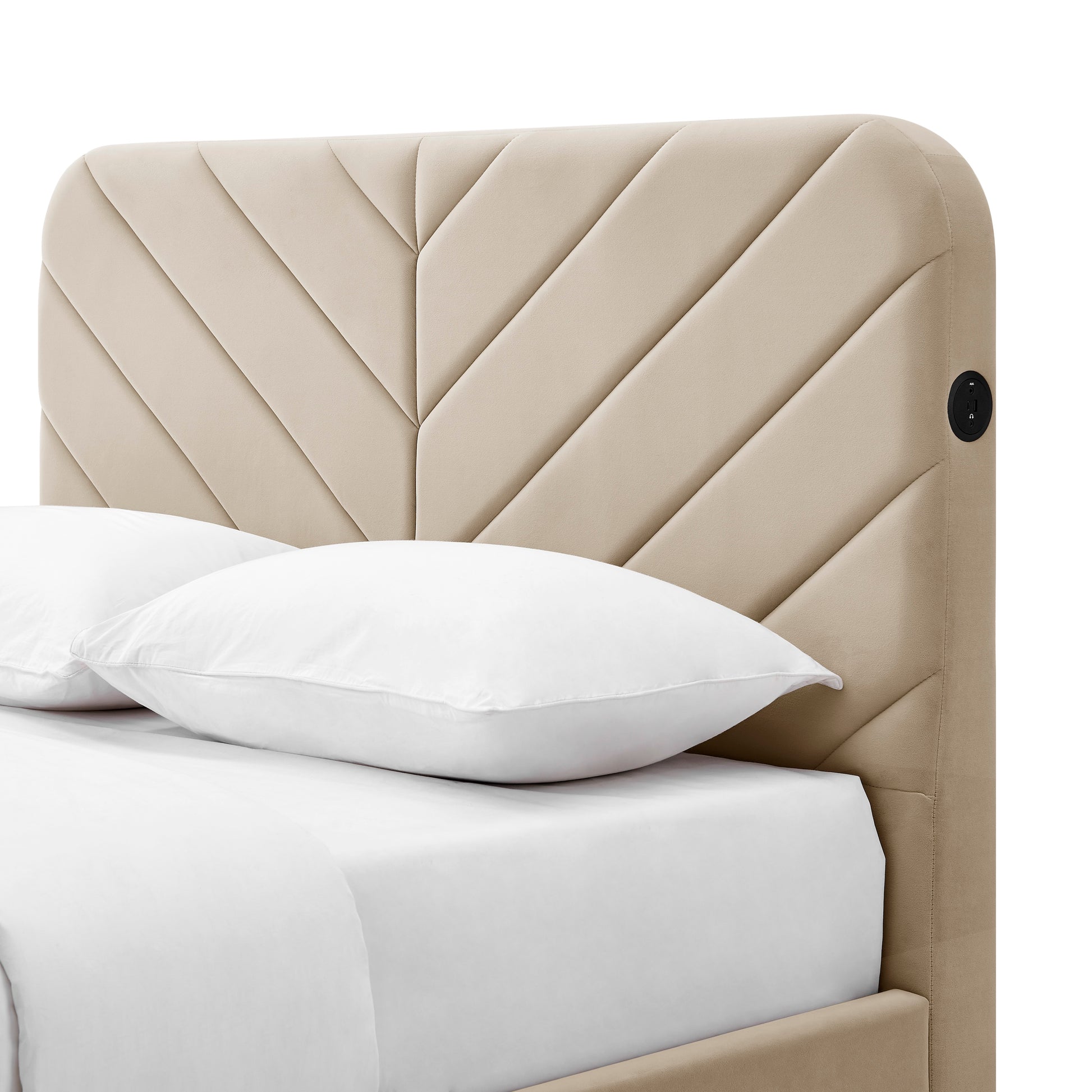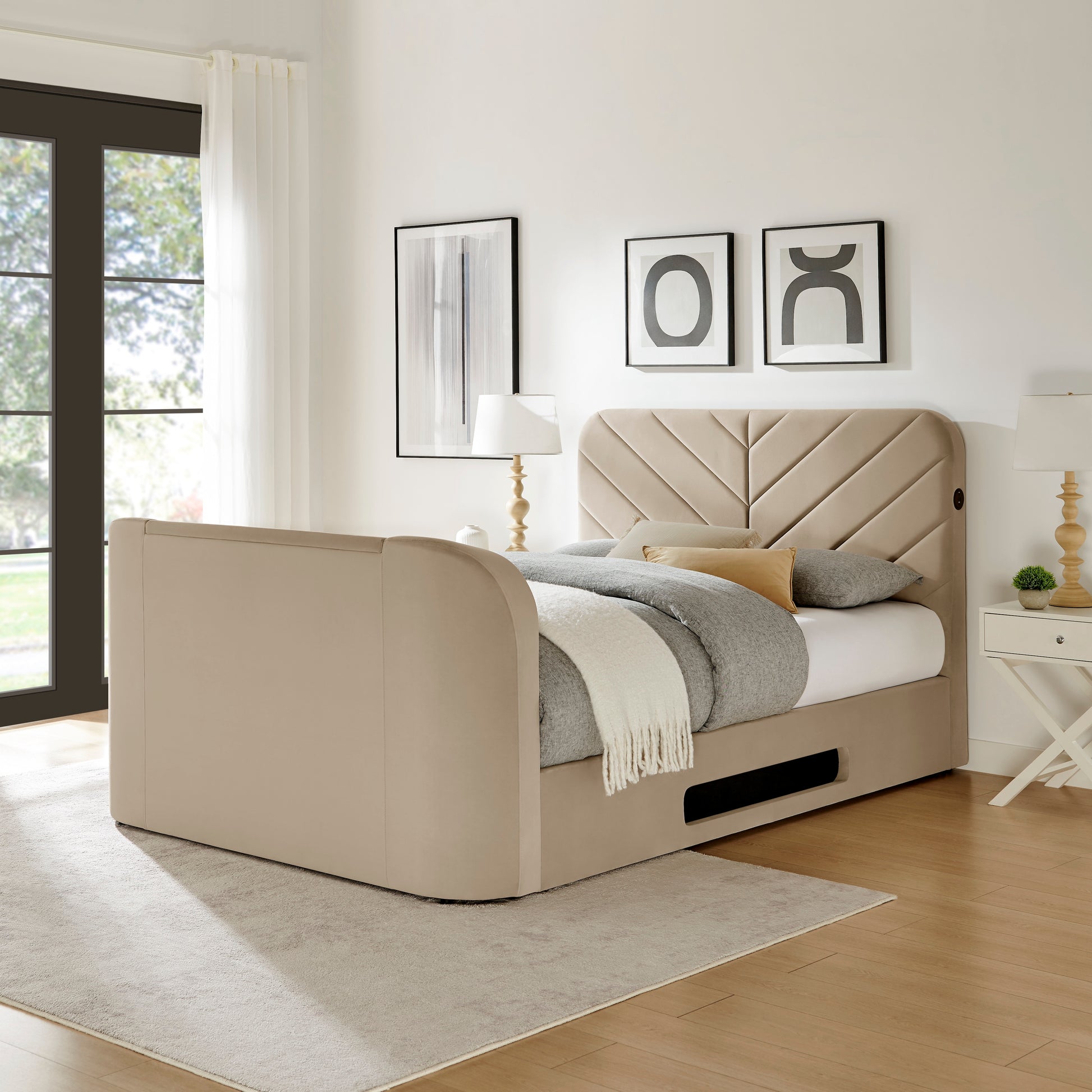 The Chevron features a powerful 2.1 audio system built into the footboard, perfect for movies, gaming or music, and an electric lift mechanism that holds TVs up to 43”. Add Bluetooth, dual USB-C charging ports, and a discreet headphone port in the headboard, and you’ve got everything you need for a true bedroom entertainment hub.