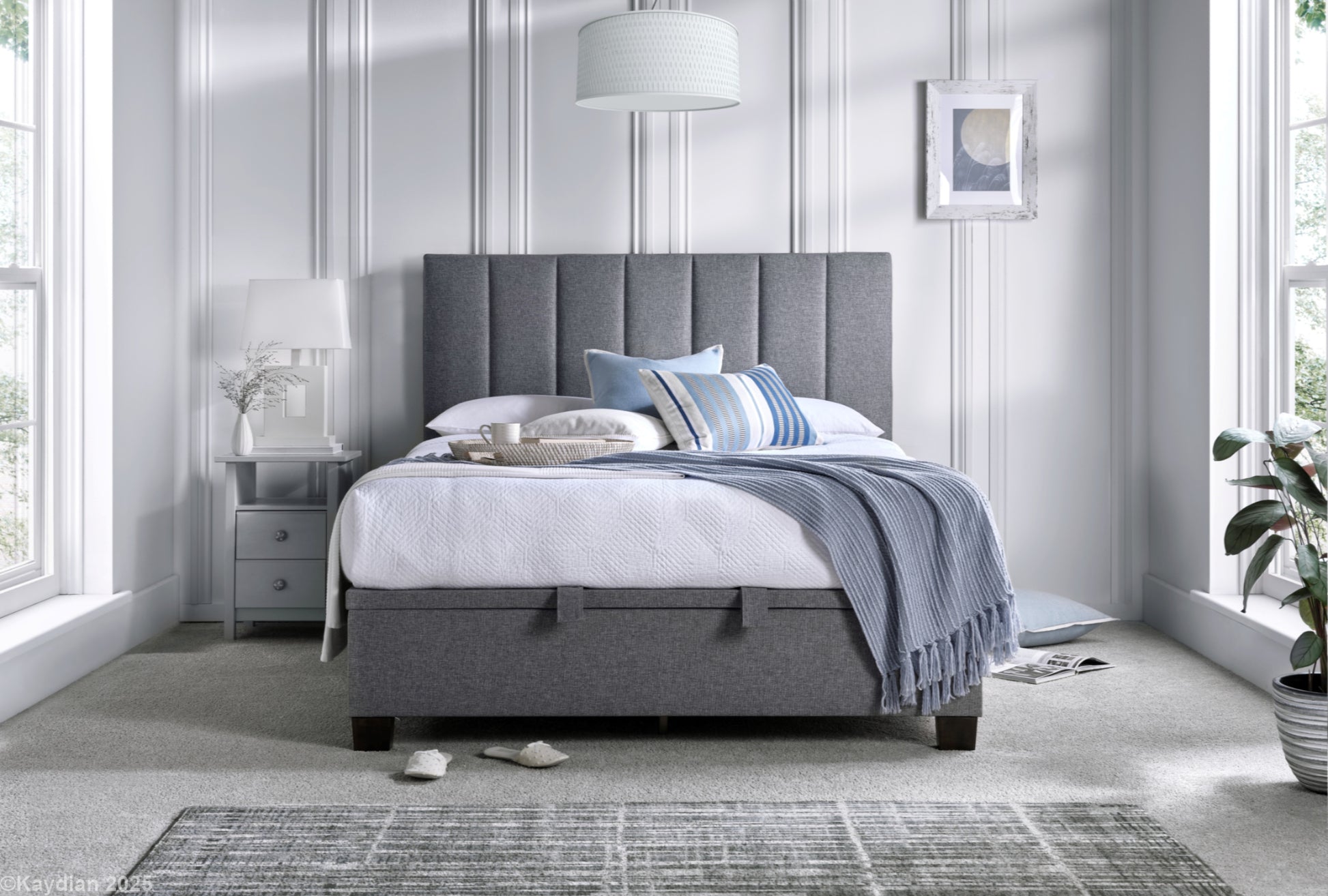The Medlam is a bold yet elegant ottoman bed that blends vertical structure with clever storage, ideal for modern interiors. Its striking vertically padded headboard creates a strong design statement, softened by quality fabric upholstery and a clean, tailored finish.