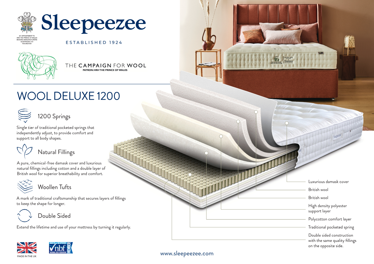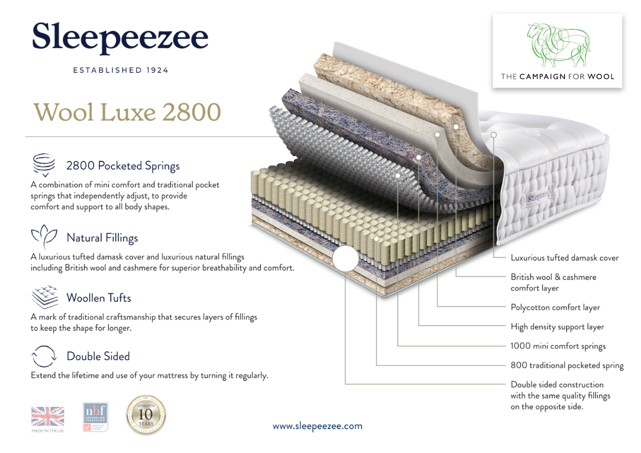 Experience the ultimate in natural comfort and luxury with Sleepeezee’s latest collection. The Campaign for Wool range brings together a beautifully refreshed look and feel with carefully selected natural materials, including Natural Wool, Silk, Cashmere, and Mohair.