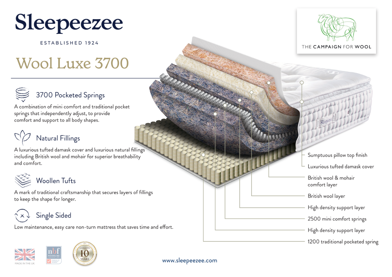 Shop hereMedium / Soft Rating, 3700 Comfort & Traditional Springs, Pillow Top, Non Turn with British Wool & Mohair Wool for luxurious comfort layer. High density support level with soft polycotton