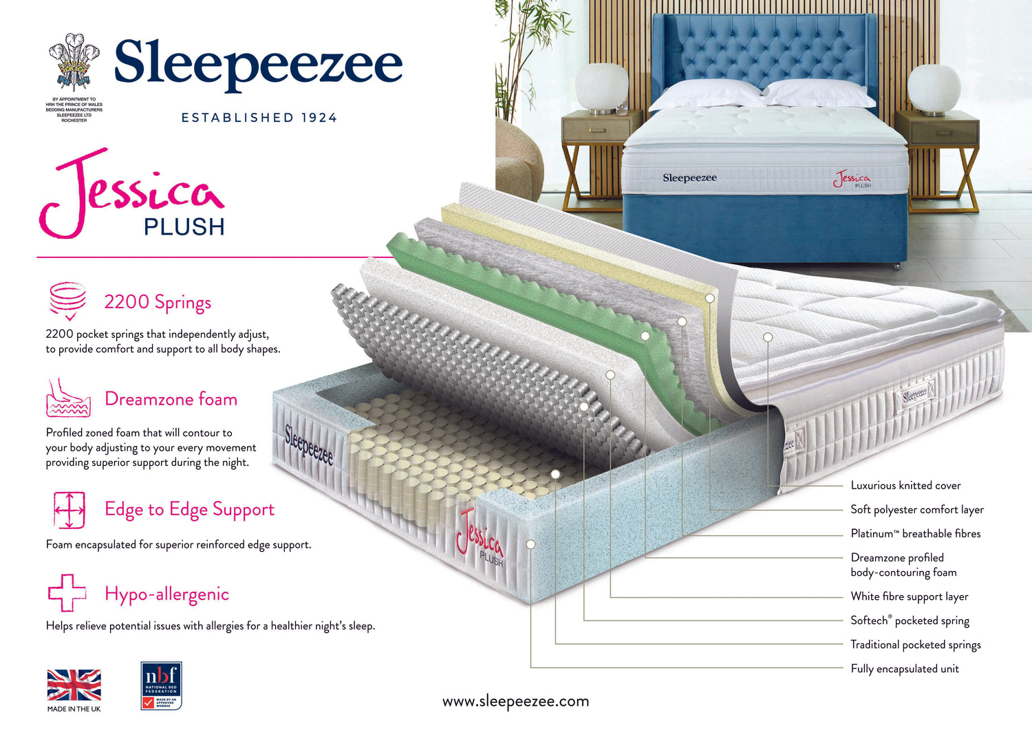Sleepeezee's Jessica Plush mattress combines the best of traditional pocket springs with 2200 softech and a sumptuous pillow top. The Jessica Plus mattress incorporates Dreamzone form and platinum breathable fibres with the finest knitted fabric cover.