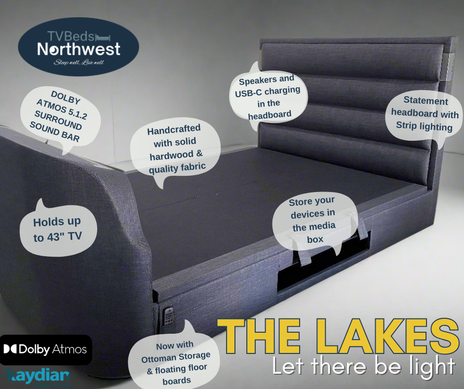 TV Beds Northwest proudly presents The Lakes TV Bed frame with Dolby Atmos surround sound system, Ottoman Storage and now soft mood lighting. Following on from the sell out success of the Edge: Dolby Atmos TV Bed and with so many TV beds on the market, what makes this one stand out? You'll get the same high quality TV bed frame as usual with Kaydian but now with Dolby's Atmos technology.
