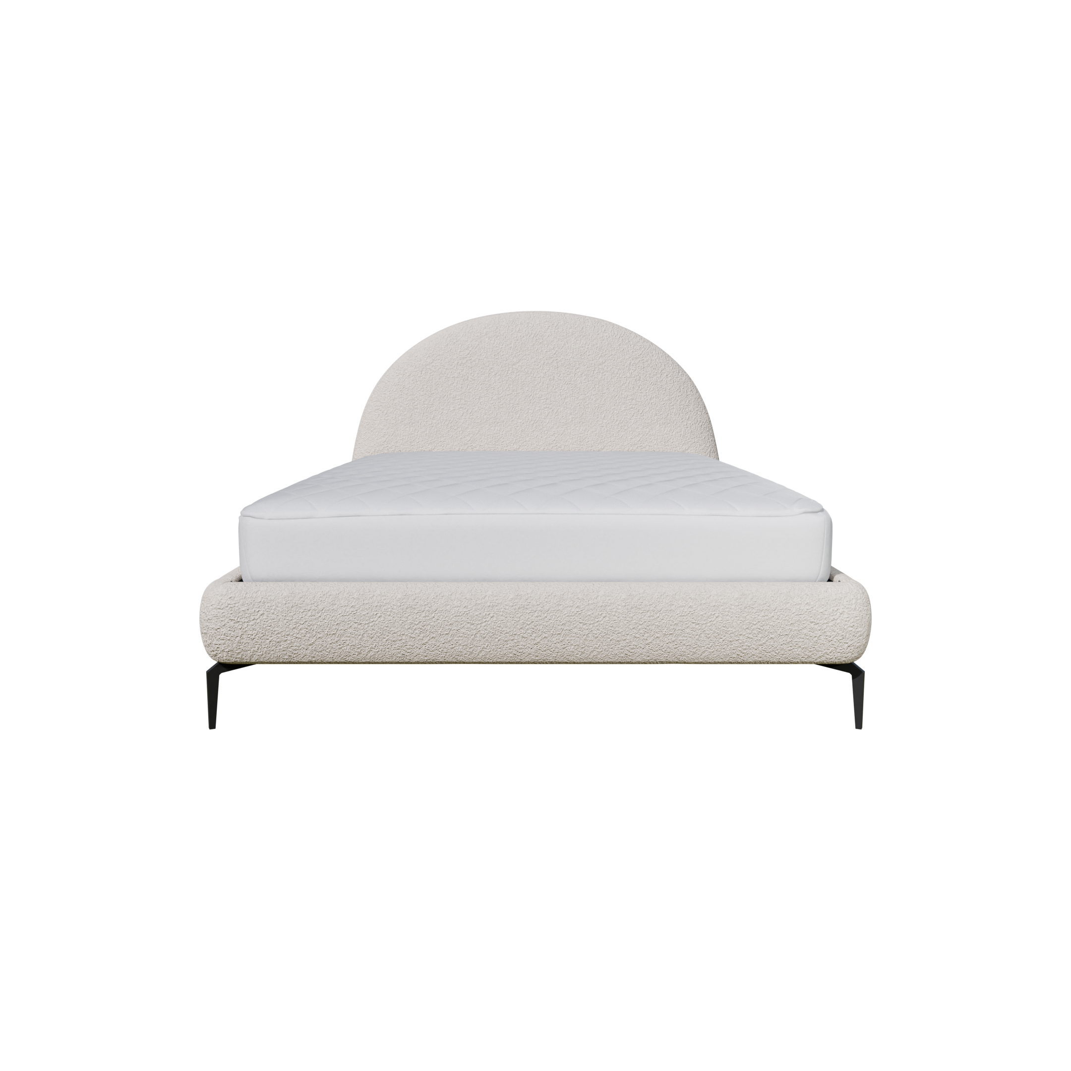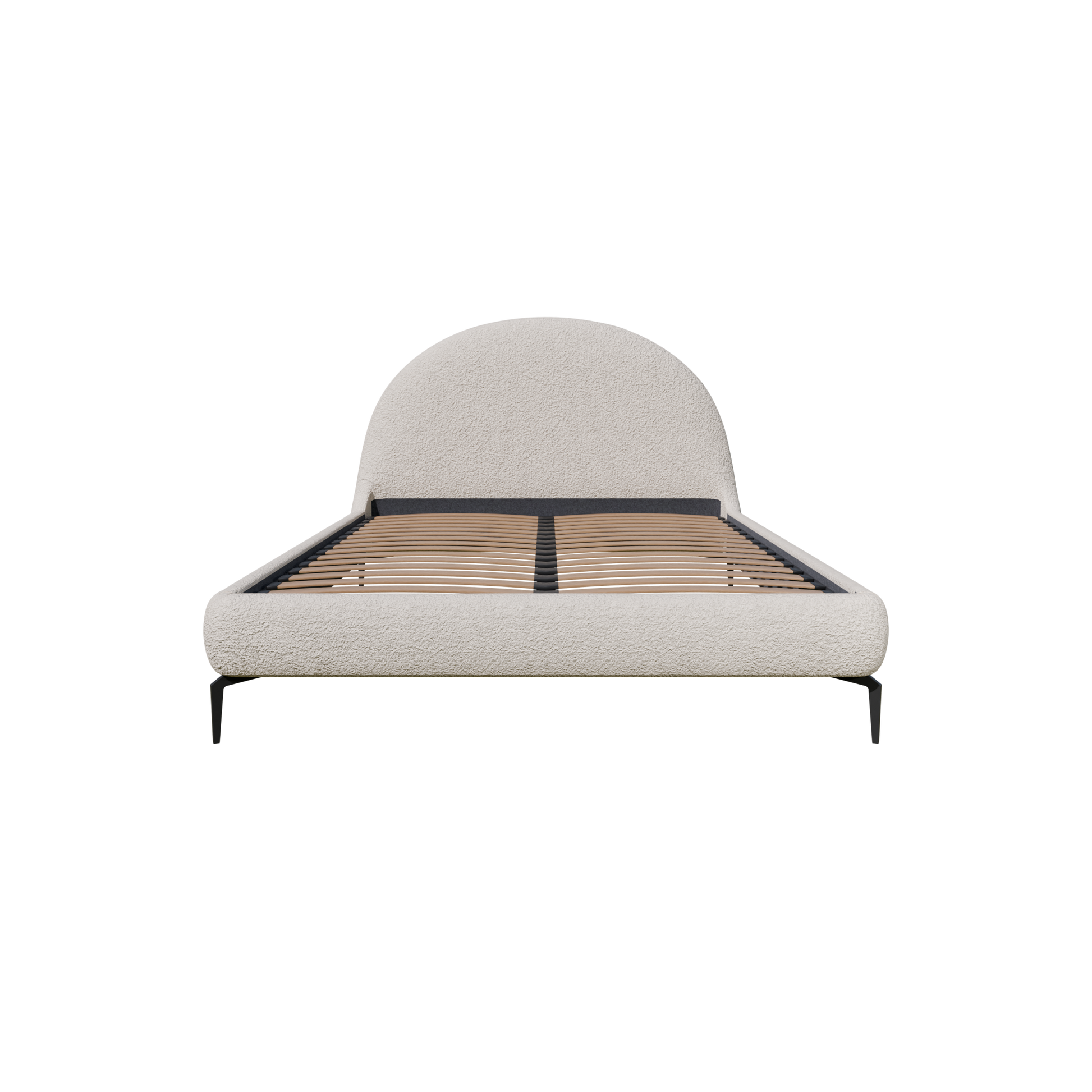 The Hanna Bed brings modern elegance into the bedroom with its soft, textured boucle fabric and distinctive dome-style headboard. Gentle curves in the design create a relaxed and inviting feel, while the bold black powder-coated metal legs add a striking contrast that makes this frame a true statement piece.